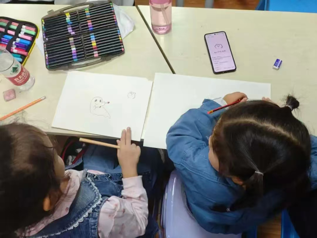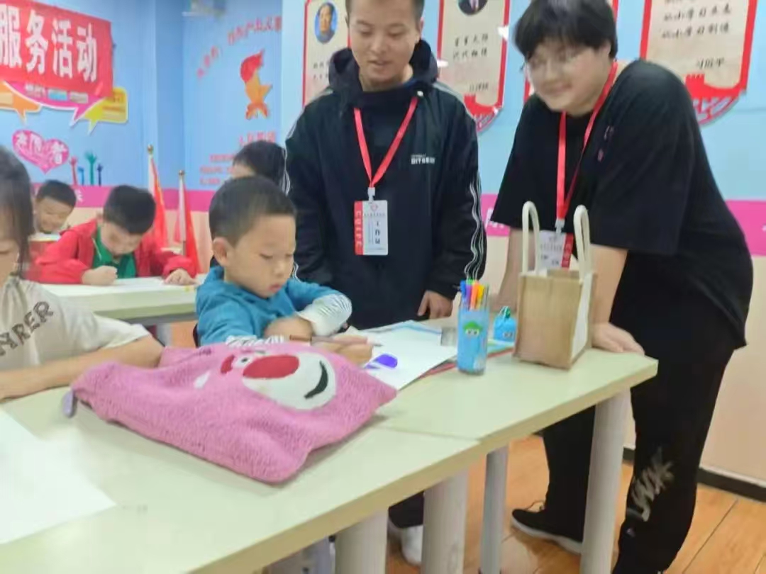 绘画环节中,志愿者们俯身相伴,从构图到色彩,从观察到想象,一一耐心引导。孩子们个个都全神贯注,沉浸在绘画的乐趣中,笔尖流淌出童真的世界:有灿烂的太阳、微笑的花朵,也有心中的家园和梦想的天空。每一幅画都是他们与世界对话的独特语言,每一次创作都伴随着发现的喜悦与成长的自信。在这个过程中,志愿者们不仅教会了小朋友们绘画的技巧,同样也让他们感受到了创造的快乐和成就感。