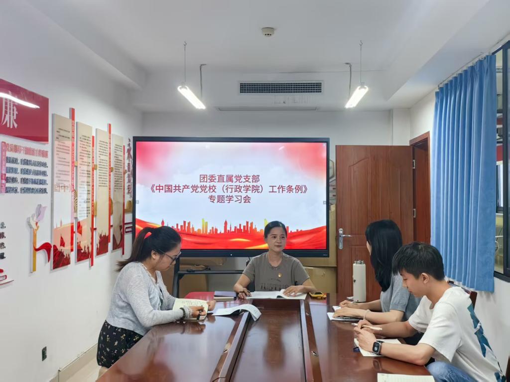 为深入学习贯彻《中国共产党党校(行政学院)工作条例》,奋力推动我校共青团工作高质量发展取得新成效,团委直属党支部于2025年9月18日召开“学《条例》 促实干|深学细悟新条例 勇毅前行谱新篇”主题党日活动,组织全体党员集中学习。